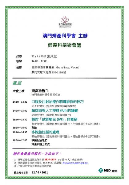 由澳門婦產科學會主辦,MSD公司贊助,將於今年4月22日在澳門金麗華酒店宴會廳舉行一個以婦產科專題講座.主講嘉賓主要來自香港多個專科醫生.其專題包括有: 口服及注射治療作誘導排卵的技巧,超排卵與人工授精(IUI)的關鍵,探討[試管嬰兒(IVF)]的奧秘及多胞胎妊娠的處理等.歡迎本會會員積極加.出席研討會者將獲發出席證書.有意者請致電: 28760520. 黃小姐或傳真: 28761133.名額: 70人.先到先得.截止報名日期: 2011年4月12日.