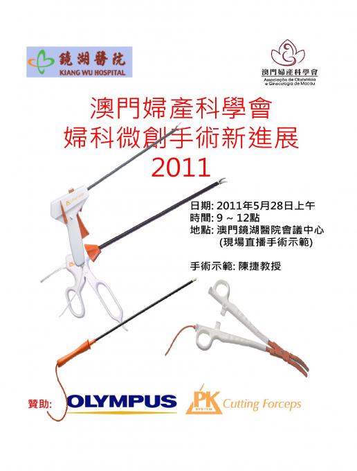 由澳門婦產科學會聯同澳門鏡湖醫院首次合作之婦科微創手術新進展手術現場直播示範將定於五月二十八日(星期六)上午假座澳門鏡湖醫院霍英東大樓十四樓會議廰舉行.是次會議得到了澳門鏡湖醫院婦產科的大力支持,同時邀請了來自福建省人民醫院陳捷教授作為是次手術示範的主講嘉賓.期間將聯同鏡湖醫院婦產科醫生及有關專業人士就有關婦科微手術技術新發展進行全面深入研討.歡迎本會全體會員參加.同時是次手術示範得到了Olympus公司的贊助.