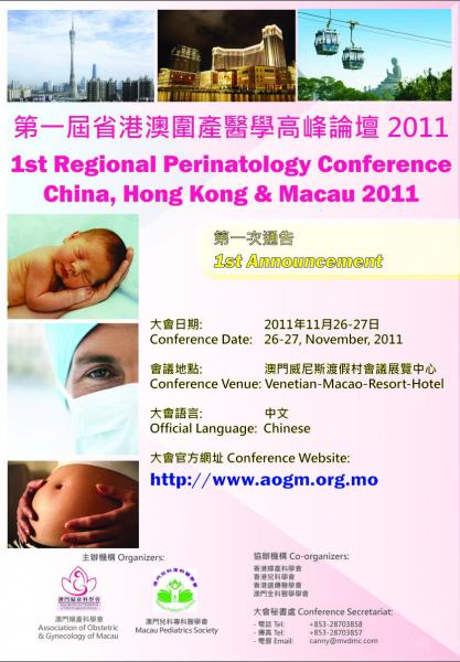 由澳門婦產科學會,澳門兒科專科醫學會共同主辦,香港婦產科學會,香港兒科學會,香港遺傳醫學會,香港助產士協會,廣東省圍產醫學會及澳門全科醫生學會等協辦;以及澳門特別行政區政府衛生局,旅遊局及澳門基金會等大力支持的第一屆省港澳圍產醫學高峰論壇將於2011年11月26日至27日在澳門威尼斯渡假村會議展覽中心舉行.屆時將邀請來自本澳,香港及廣東省等多位珠三角地區圍產醫學專家學者共聚一堂,共同交流有關醫學發展新技術及新動向.